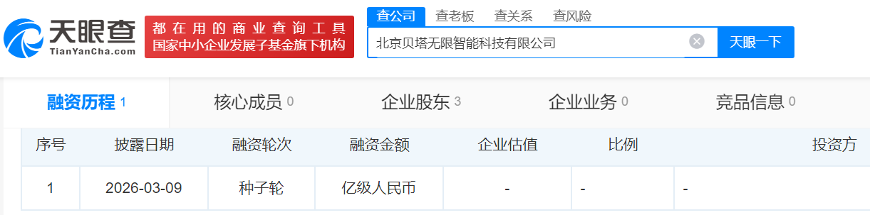 瑞财经 王敏 3月11日,据天眼查,华为前高管刘武龙创立具身智能公司北京贝塔无限智能科技有限公司(以下简称“贝塔无限”)已完成近亿元种子轮融资,投资方包括洪泰基金、正景基金、银杏谷资本、水木清华校友种子基金等。