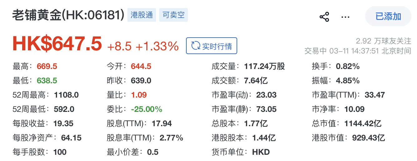 截至发稿时, 老铺黄金报647.5港元,涨1.33%,总市值约1144.42亿港元。
