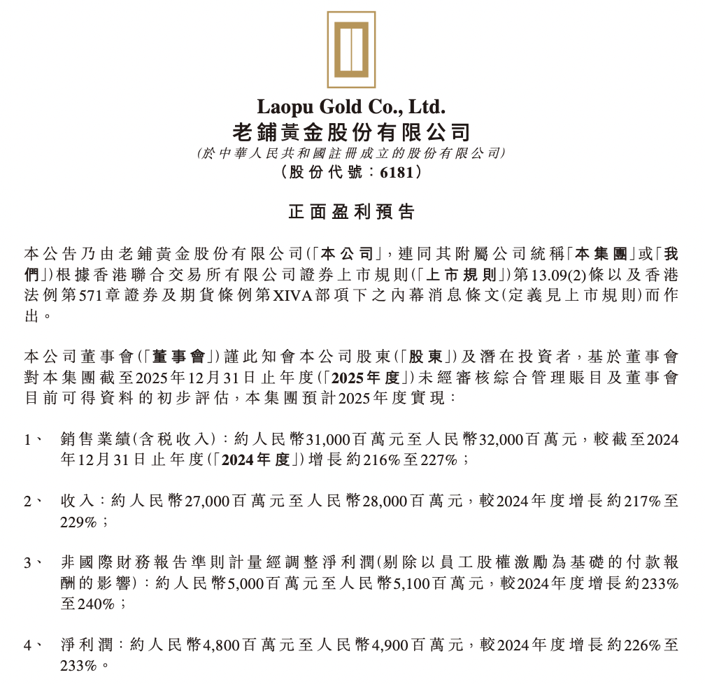 老铺黄金预计2025年净利最高增233%至49亿元,已启动2026年首次调价