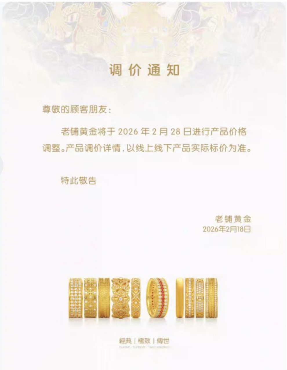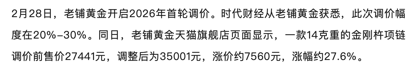 值得关注的是,2026年开年,国内黄金珠宝市场迎来一轮集体涨价潮。据媒体报道,老铺黄金以20%-30%的涨幅成为市场焦点,创下品牌史上最大单次涨幅纪录。