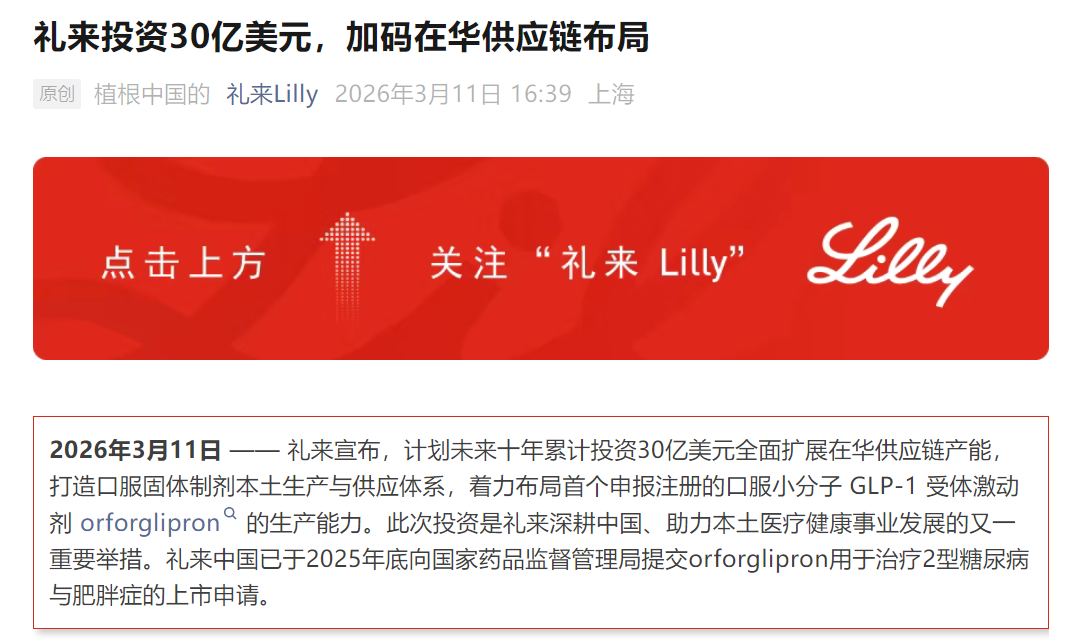 瑞财经 王敏 3月11日,礼来宣布,计划未来十年累计投资30亿美元全面扩展在华供应链产能,打造口服固体制剂本土生产与供应体系,着力布局首个申报注册的口服小分子GLP‑1受体激动剂orforglipron的生产能力。