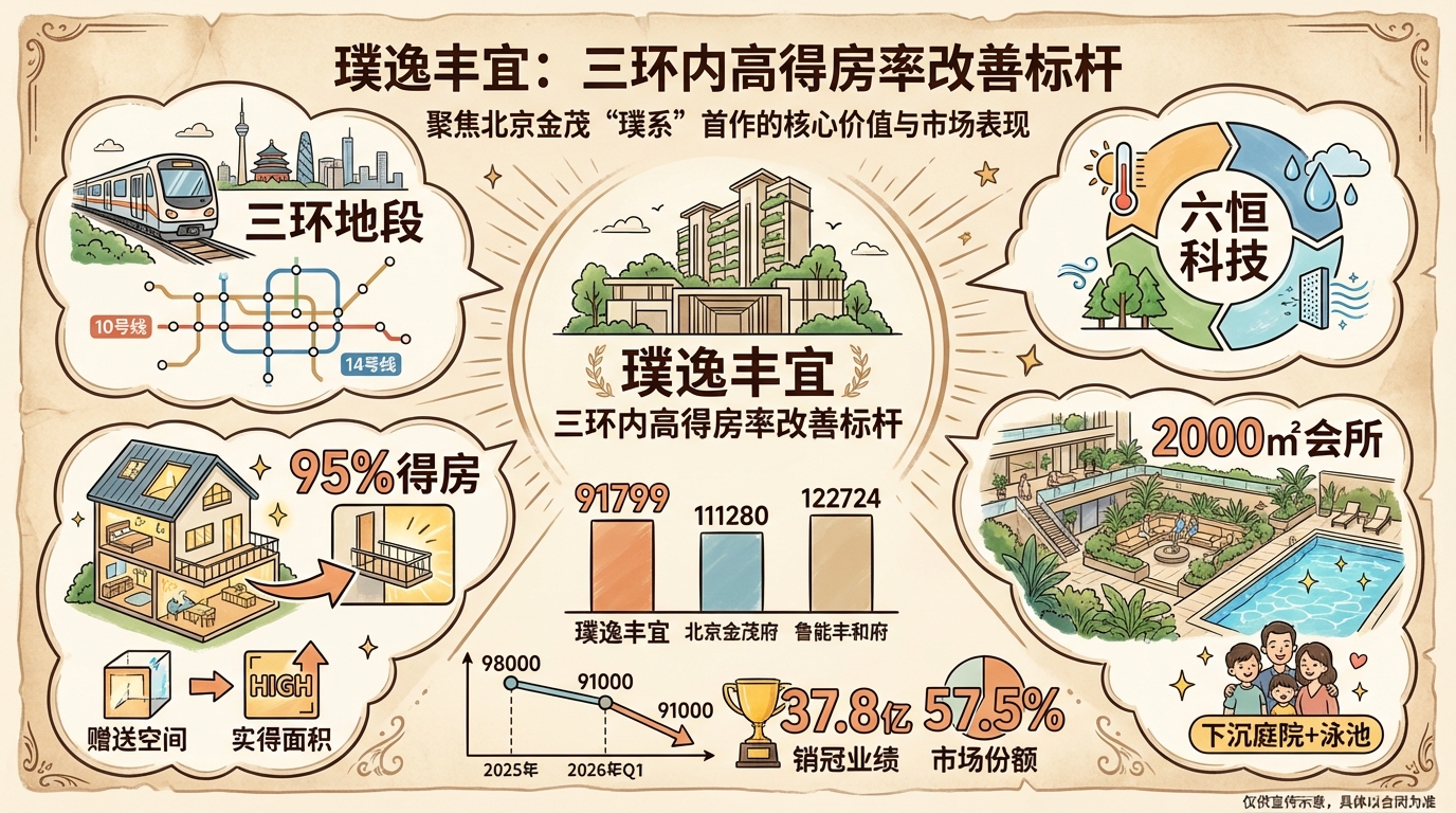 2025年1月,中国金茂“璞系”北京首作——璞逸丰宜正式入市。截至2026年3月,项目累计成交面积41214平方米、成交套数290套,成交均价91799元/平方米,整体去化率达57.5%(基于总供应面积71935平方米计算),2025年全年网签金额达32.48亿元,成为四环内新房签约金额销冠。