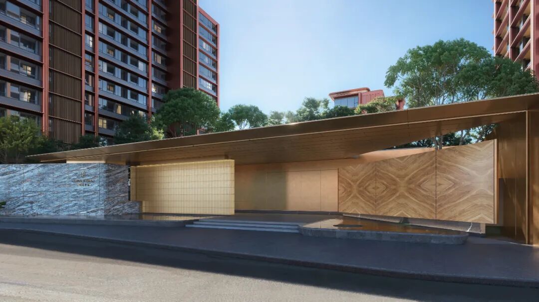 外立面采用石材、幕墙与铝板组合,现代简约风格搭配新中式园林元素。