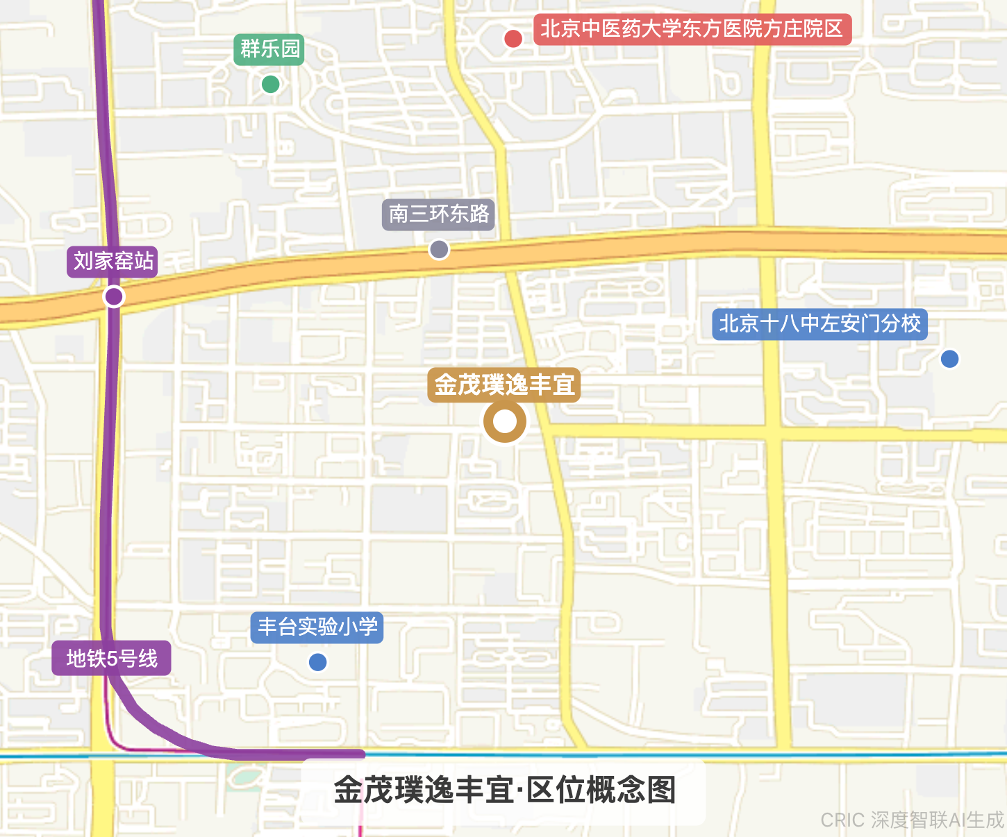 商业配套方面,周边3公里内有方庄购物中心、新业广场、荟聚、宜家、山姆会员店等大型商场;7公里内覆盖协和医院、同仁医院、北京医院、东方医院等七家三甲医院。教育资源包括成寿寺小学(1223米)、丰台实验小学(约2公里)、十一学校丰台中学等。