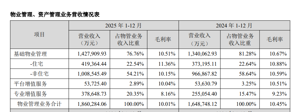 从物业管理业务的收入构成看,基础物业管理实现营业收入142.79亿元,同比增长6.56%;平台增值服务实现营业收入5.37亿元,同比增长0.18%;专业增值服务实现营业收入37.86亿元,同比增长48.46%。