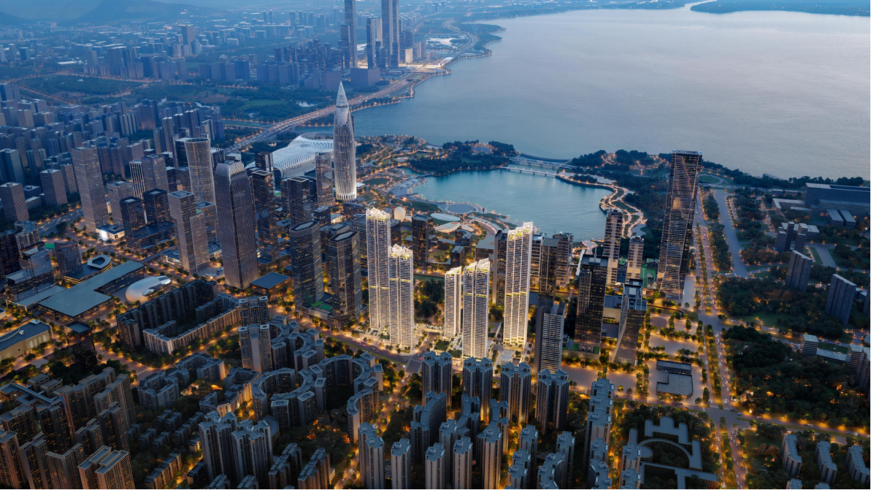 项目由五座150米至250米的塔楼组成,采用全向东布局,东侧直面深圳人才公园,眺望深圳湾。
