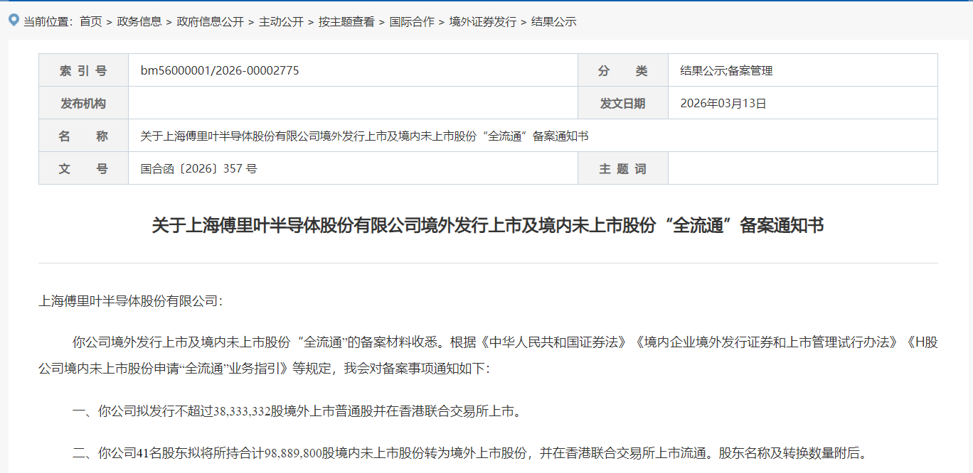 瑞财经 王敏 3月13日,中国证监会国际合作司发布关于上海傅里叶半导体股份有限公司(以下简称“傅里叶半导体”)境外发行上市及境内未上市股份“全流通”备案通知书。
