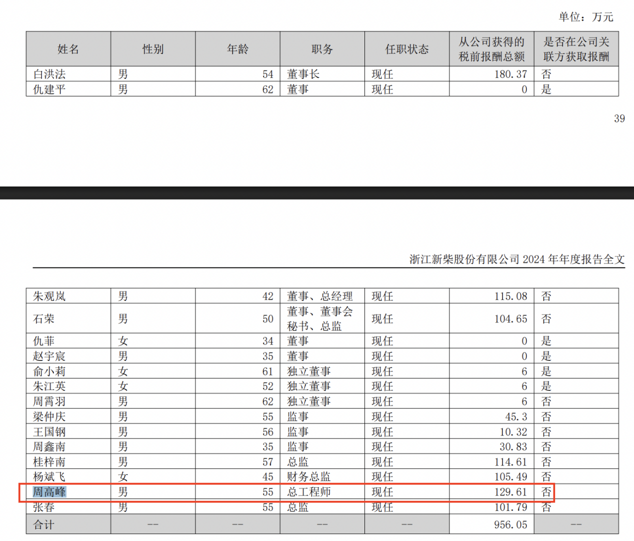 2024年,周高峰从新柴股份获得的税前报酬总额为129.61万元,位居董监高第二。