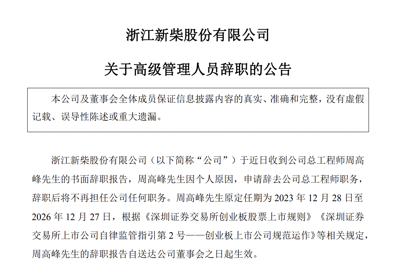 瑞财经 刘治颖 3月13日,新柴股份(SZ301032)公告,周高峰因个人原因,申请辞去公司总工程师职务,辞职后将不再担任公司任何职务。周高峰原定任期为2023年12月28日至2026年12月27日。