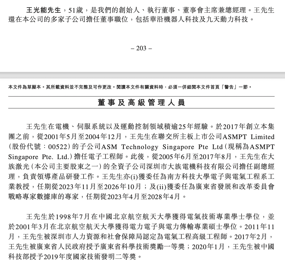 资料显示,王光能,51岁,是公司的创始人、执行董事、董事会主席兼总经理。王光能还在公司的多家子公司担任董事职位,包括华沿机器人科技及九天动力科技。