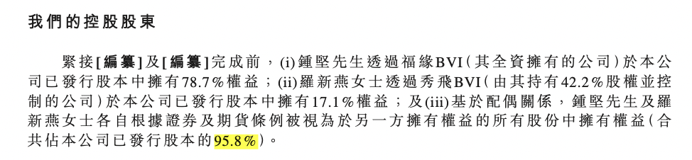 IPO前,钟坚透过福缘BVI(其全资拥有的公司)于公司已发行股本中拥有78.7%权益;罗新燕透过秀飞BVI(由其持有42.2%股 权并控制的公司)于公司已发行股本中拥有17.1%权益;及基于配偶关系,钟坚及罗新燕各自根据证券及期货条例被视为于另一方拥有权益的所有股份中拥有权益(合共占公司已发行股本的95.8%)。