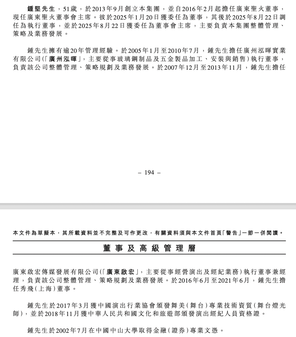 资料显示,钟坚,51岁,于2013年9月创立集团,并自2016年2月起担任广东圣火董事,现任广东圣火董事会主席。其于2025年1月20日获委任为董事,其后于2025年8月22日调任为执行董事,并于2025年8月22日获委任为董事会主席,主要负责集团整体管理、 策略及业务发展。