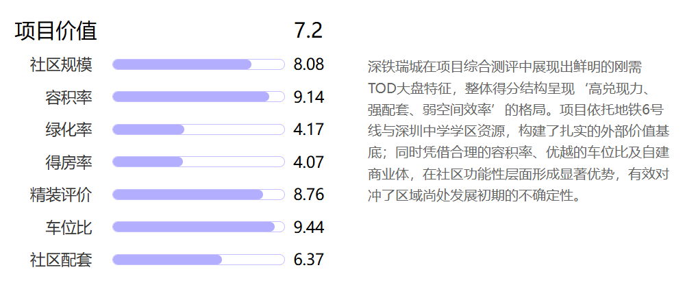 综合概述:克而瑞好房点评网指出,深铁瑞城在项目综合测评中展现出鲜明的刚需TOD大盘特征,整体得分结构呈现‘高兑现力、强配套、弱空间效率’的格局。项目依托地铁6号线与深圳中学学区资源,构建了扎实的外部价值基底;同时凭借合理的容积率、优越的车位比及自建商业体,在社区功能性层面形成显著优势,有效对冲了区域尚处发展初期的不确定性。