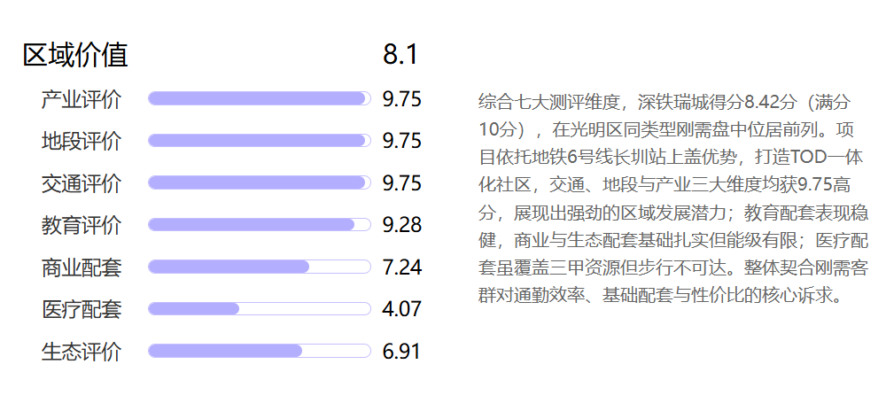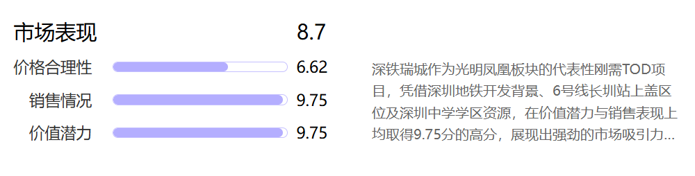 综合概述:克而瑞好房点评网分析认为,深铁瑞城作为光明凤凰板块的代表性刚需TOD项目,凭借深圳地铁开发背景、6号线长圳站上盖区位及深圳中学学区资源,在价值潜力与销售表现上均取得9.75分的高分,展现出强劲的市场吸引力和兑现能力;但其价格合理性评分仅为6.62分,反映出当前定价与公允价值存在一定偏离,叠加社区混居、车位比偏低等产品短板,整体呈现‘高潜力、中定价、强去化’的典型特征。