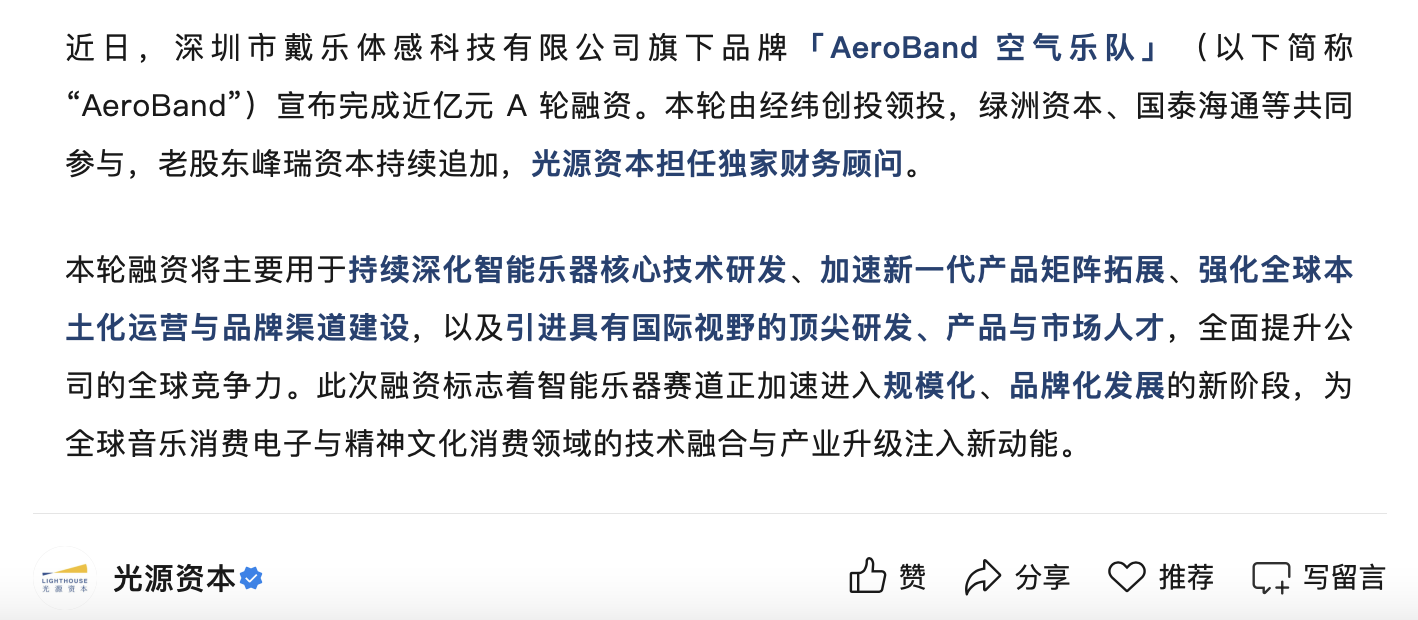 瑞财经 吴文婷 3月17日,据光源资本,深圳市戴乐体感科技有限公司旗下品牌AeroBand空气乐队(以下简称“AeroBand”)宣布完成近亿元A轮融资。