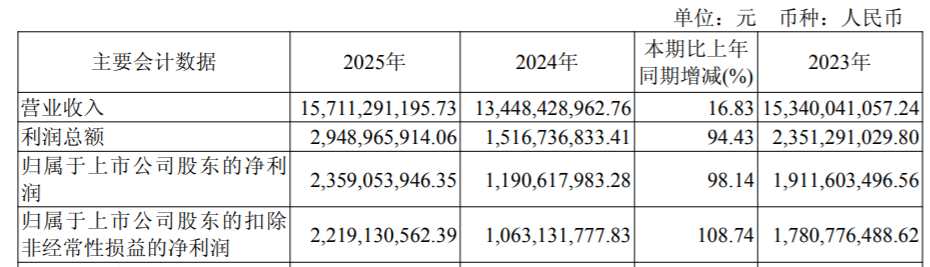 2025年,璞泰来营收净利双增,其中营业收入同比增长16.83%,归母净利润同比增长98.14%。