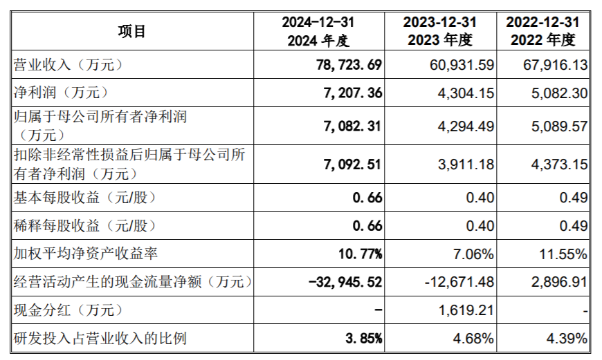 根据前次申报材料显示,2022年、2023年、2024年,株洲科能营收分别为6.79亿元、6.10亿元、7.87亿元;净利分别为5082万元、4304万元、7207万元。