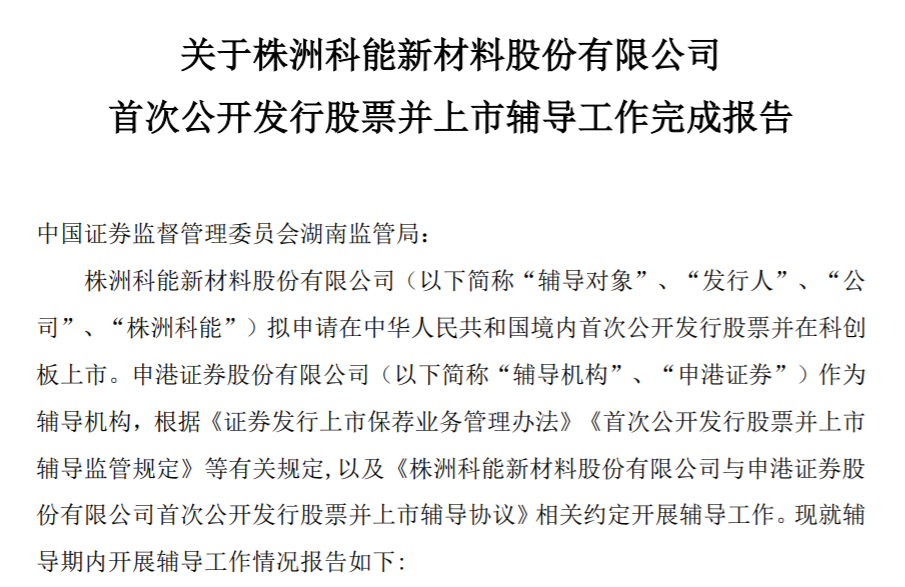 瑞财经 王敏 3月16日,株洲科能新材料股份有限公司(以下简称“株洲科能”)披露科创板IPO辅导工作完成报告,历时4个月。