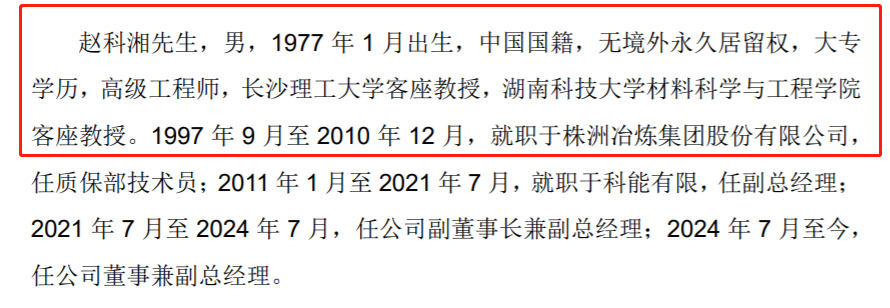 赵科湘,男,1977年1月出生,中国国籍,无境外永久居留权,大专学历,高级工程师,长沙理工大学客座教授,湖南科技大学材料科学与工程学院客座教授。1997年9月至2010年12月,就职于株洲冶炼集团股份有限公司,任质保部技术员;2011年1月至2021年7月,就职于科能有限,任副总经理;2021年7月至2024年7月,任公司副董事长兼副总经理;2024年7月至今,任公司董事兼副总经理。
