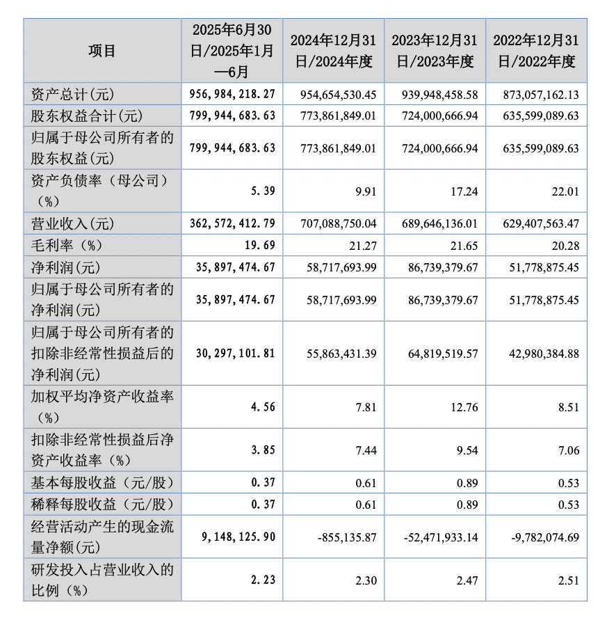 2022年-2024年及2025上半年,族兴新材实现营收分别为6.29亿元、6.9亿元、7.07亿元、3.63亿元;归母净利润分别为5177.89万元、8673.94万元、5871.77万元、3589.75万元。