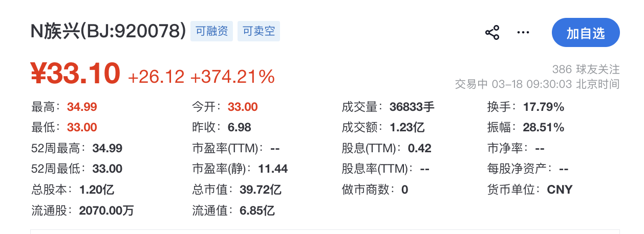 瑞财经 刘治颖 3月18日,族兴新材(920078.BJ)在北交所挂牌上市,保荐机构为西部证券,开盘涨374.21%,总市值39.72亿元。