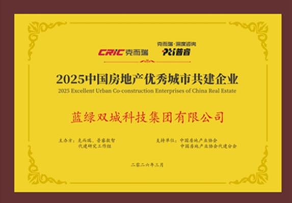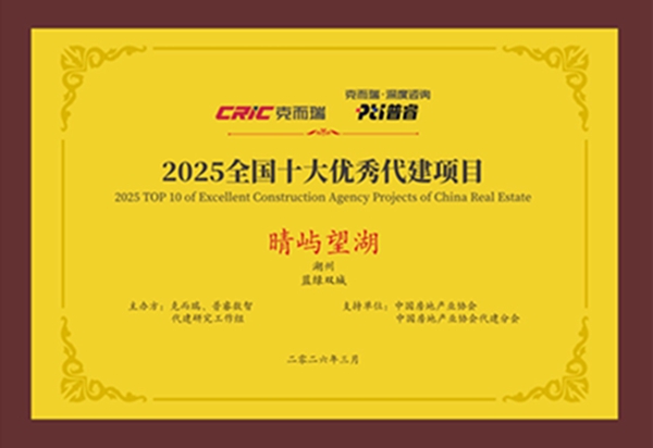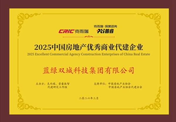 在本次大会期间,由中国房地产业协会和中国房地产业协会代建分会指导,克而瑞、普睿数智联合发布的“2025中国房企代建综合能力TOP10”研究成果显示,蓝绿双城科技集团有限公司跻身“2025中国房企代建综合能力TOP10”,并荣膺“2025中国房地产优秀城市共建企业”、“2025中国房地产优秀商业代建企业”等殊荣,“晴屿望湖”(湖州首个好房子项目)以叫好又叫座的品质呈现和市场表现荣获“2025全国十大优秀代建项目”。