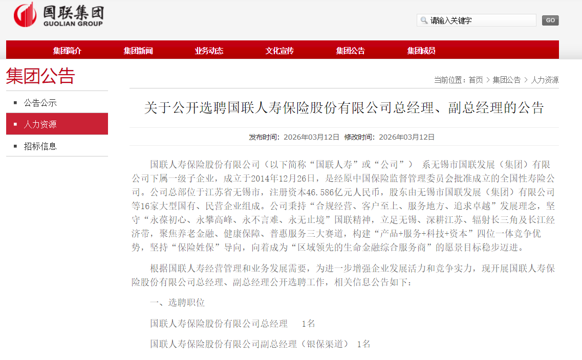 公告还称,本次选聘旨在引入高素质管理人才,助力国联人寿提升经营管理水平与综合竞争实力。