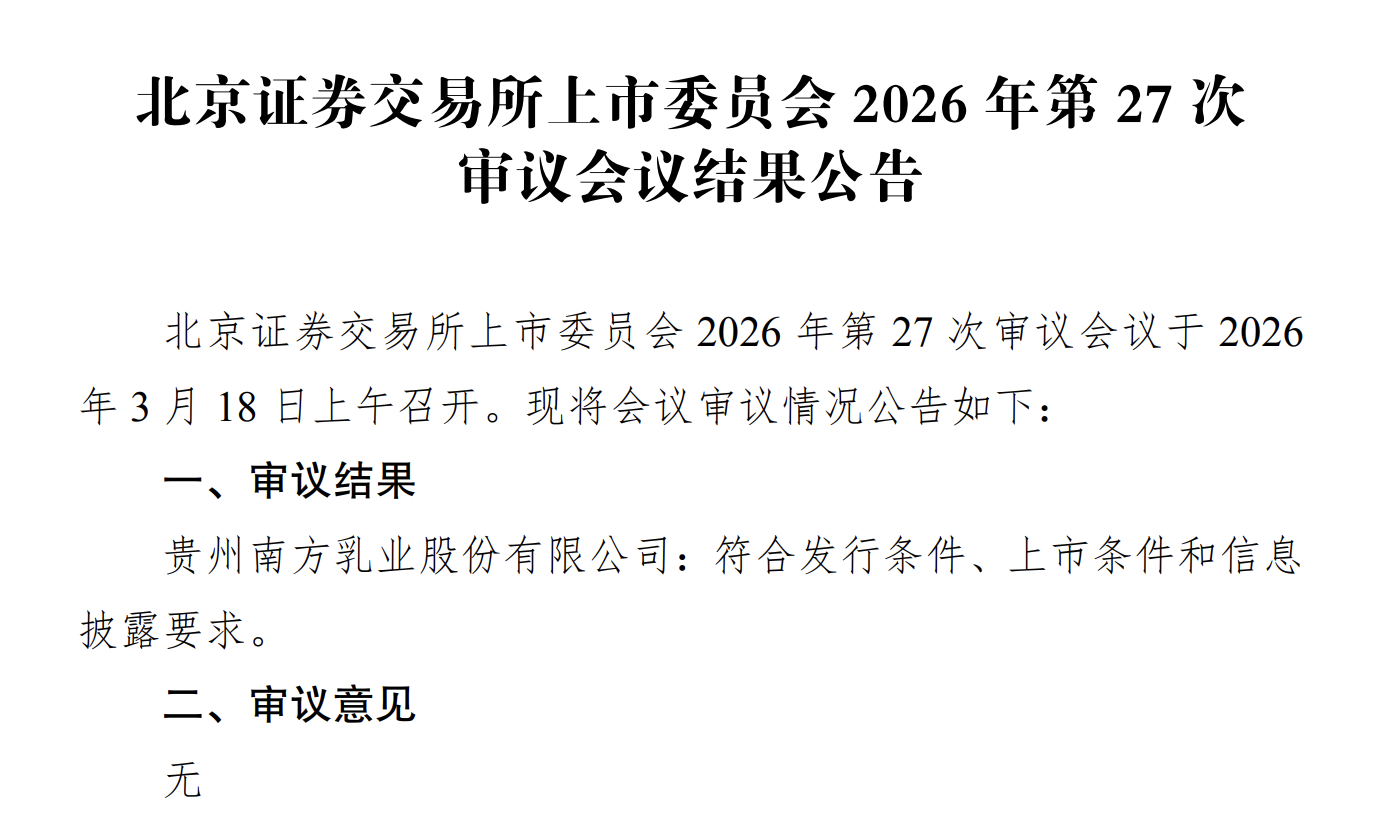 瑞财经 刘治颖 3月18日,据北交所披露,贵州南方乳业股份有限公司(以下简称:南方乳业)符合发行条件、上市条件和信息披露要求。