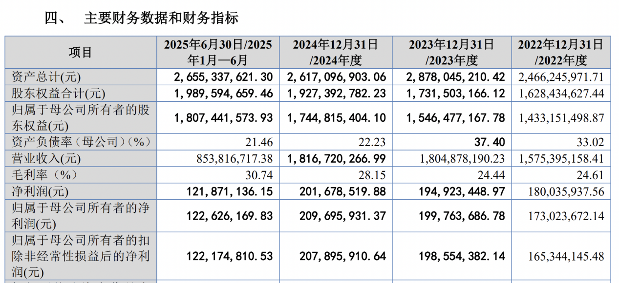 2022年-2024年及2025年1-6月,公司分别实现营业收入15.75亿元、18.05亿元、18.17亿元及8.54亿元;归属于母公司所有者的净利润分别为1.73亿元、2亿元、2.10亿元及1.23亿元;毛利率分别为24.61%、24.44%、28.15%及30.74%。