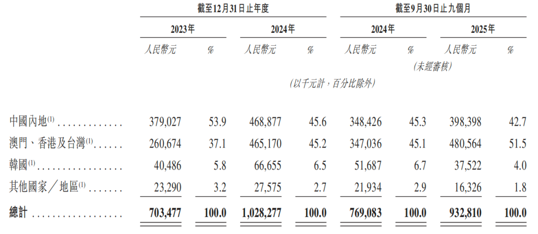 聚辰股份也不例外,各期,聚辰股份芯片出货量分别为24.32亿颗、33.13亿颗、27.44亿颗,来自中国内地市场以外的收入占比分别为46.1%、54.4%、57.8%。其中,澳门、香港及台湾地区占比逐年走高,2025年1-9月,合计占比达51.5%。
