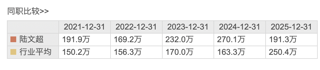 东方财富数据显示,2021年至2025年,陆文超薪酬分别为191.9万元、169.2万元、232.0万元、270.1万元、191.3万元。其中2025年薪酬下滑29.17%。