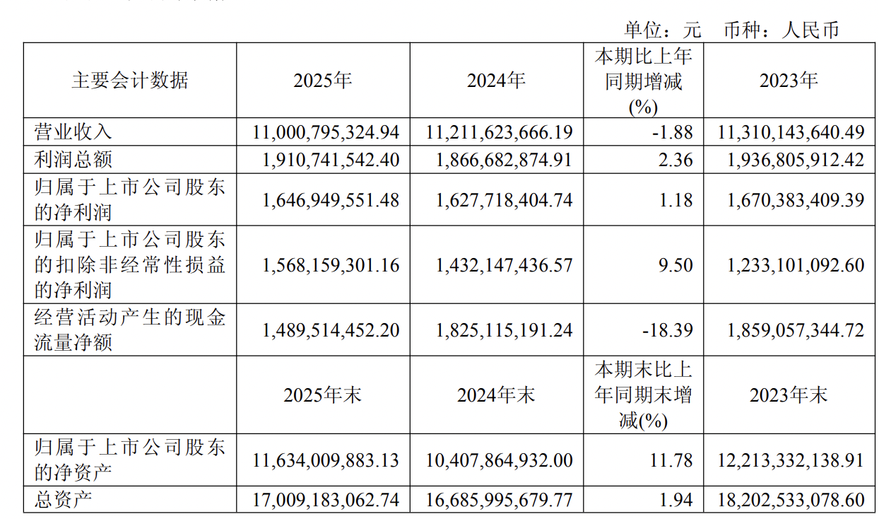 2025年,华润双鹤实现营业收入110.01 亿元,同比减少1.88%;归属于上市公司股东的净利润 16.47 亿元,同比增长1.18%;归属于上市公司股东的扣除非经常性损益的净利润15.68亿元,同比增长9.5%。