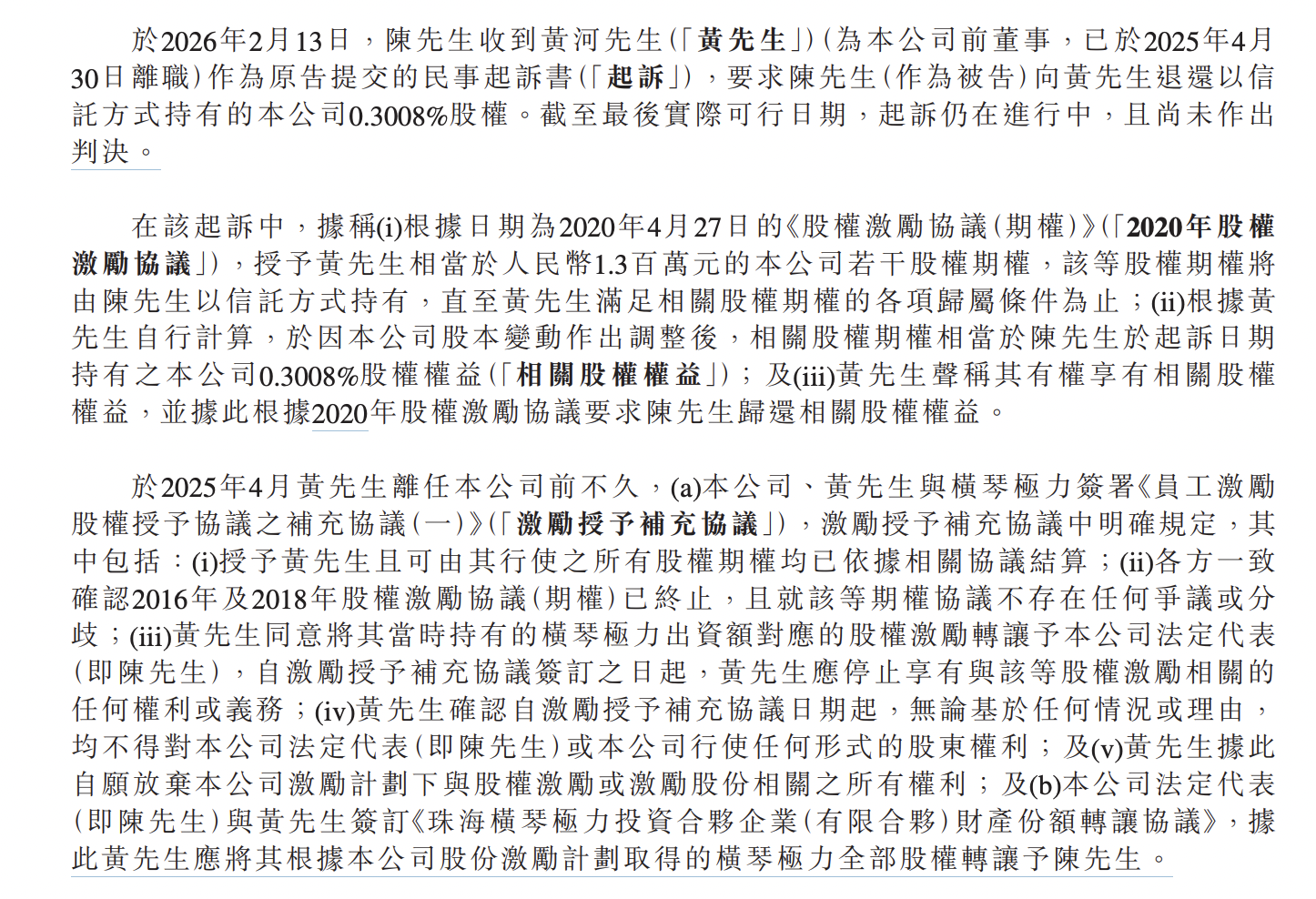 招股书显示,在黄河离职前夕,极视角、黄河与横琴极力于2025年4月签署《员工激励股权授予协议之补充协议(一)》,核心约定如下:黄河名下所有已授予可行使的股权期权均已依据相关协议结算;2016年及2018年股权激励协议均已终止,各方无争议;黄河同意将持股平台财产份额转让给陈振杰;黄河确认不再对公司及法定代表人主张任何股东权利。