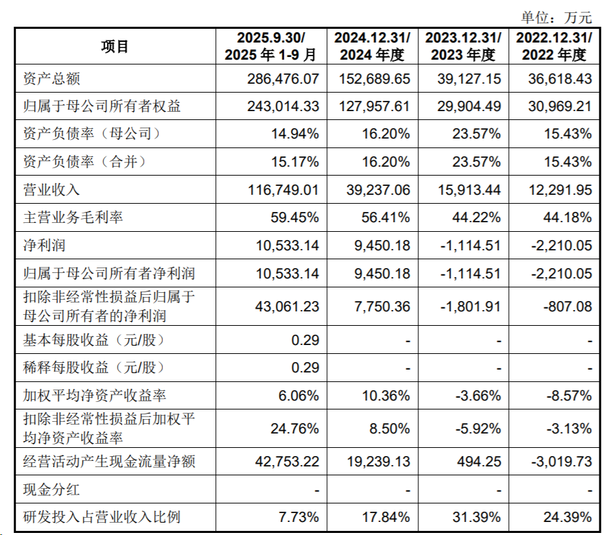 业绩方面,2022年至2024年及2025年前9个月,公司营业收入分别为1.22亿元、1.59亿元、3.92亿元、11.67亿元,净利润分别为-2210.05万元、-1114.51万元、9450.18万元、1.05亿元。