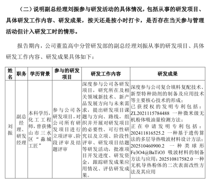 北交所点名要求公司回复副总经理刘振参与研发活动的具体情况,包括从事的研发项目、具体研发工作内容、研发成果,按天还是按小时打卡,是否存在当天参与管理活动但计入研发工时的情形。