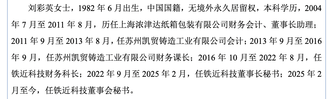 资料显示,刘彩英,女,1982年6月出生,中国国籍,无境外永久居留权,本科学历,2004年7月至2011年8月,历任上海浓津达纸箱包装有限公司财务会计、董事长助理;2011年9月至2013年8月,任苏州凯贸铸造工业有限公司会计;2013年9月至2016年9月,任苏州凯贸铸造工业有限公司财务课长;2016年10月至2022年8月,任铁近科技财务科长;2022年9月至2025年2月,任铁近科技董事长秘书;2025年2月至今,任铁近科技董事会秘书。