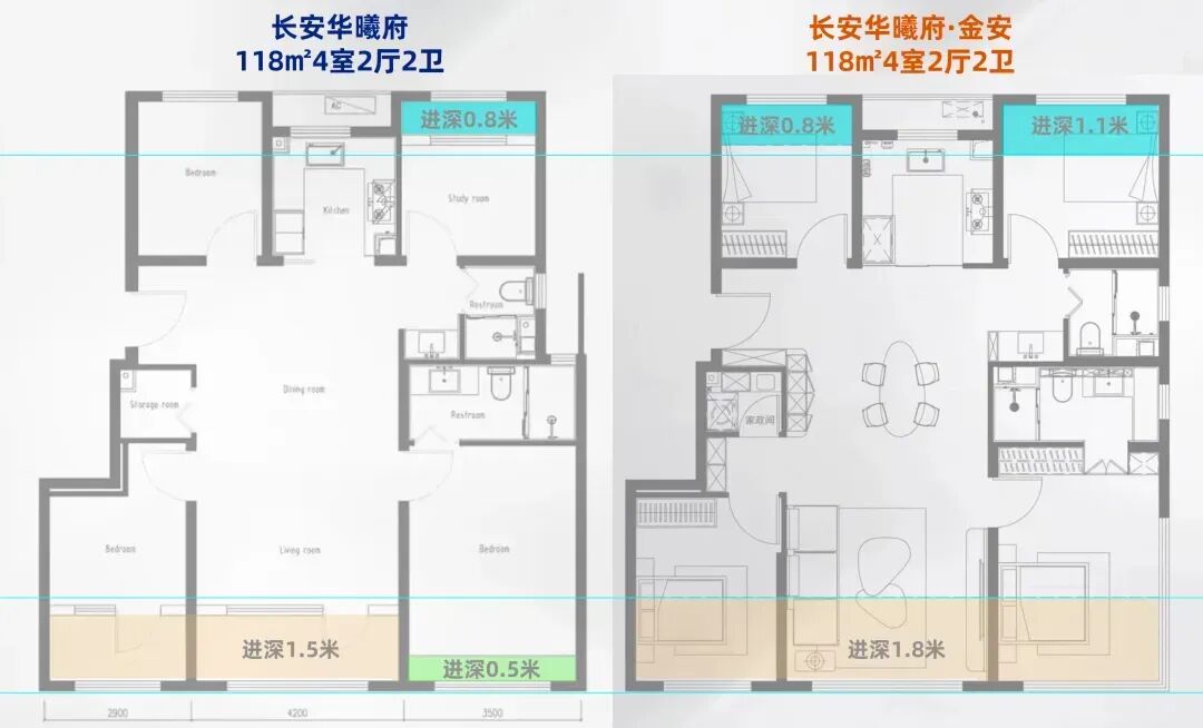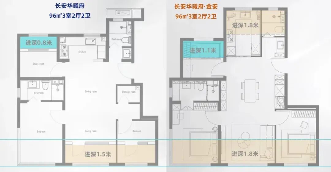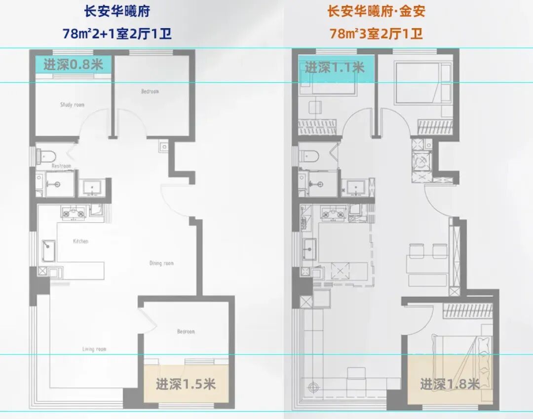 包括78㎡的2 1小三居,96㎡南向三面宽的功能三居,118㎡南向两面宽的舒适三居。