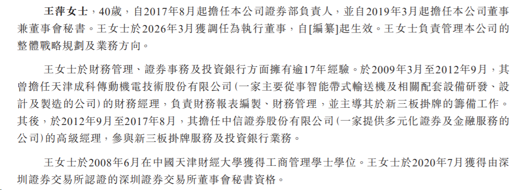 王萍,40岁,自2017年8月起担任公司证券部负责人,并自2019年3月起担任公司董事兼董事会秘书。于2026年3月获调任为执行董事。她负责管理公司的整体战略规划及业务方向。