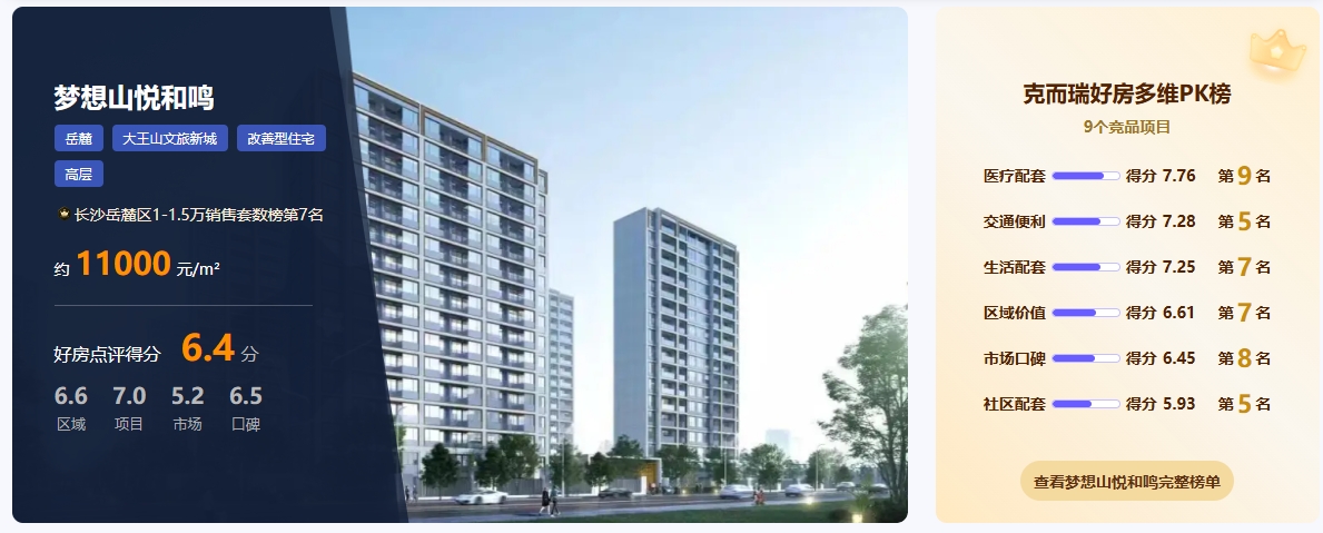 优势概述:根据克而瑞好房点评网测评,梦想山悦和鸣的优势集中于交通、产品与品牌三大维度。项目以“双轨高得房率刚改盘”为核心标签,凭借110%复式得房率、双轨交通体系及湘江集团国企交付保障,精准匹配注重空间效率与通勤便利的刚改家庭需求。