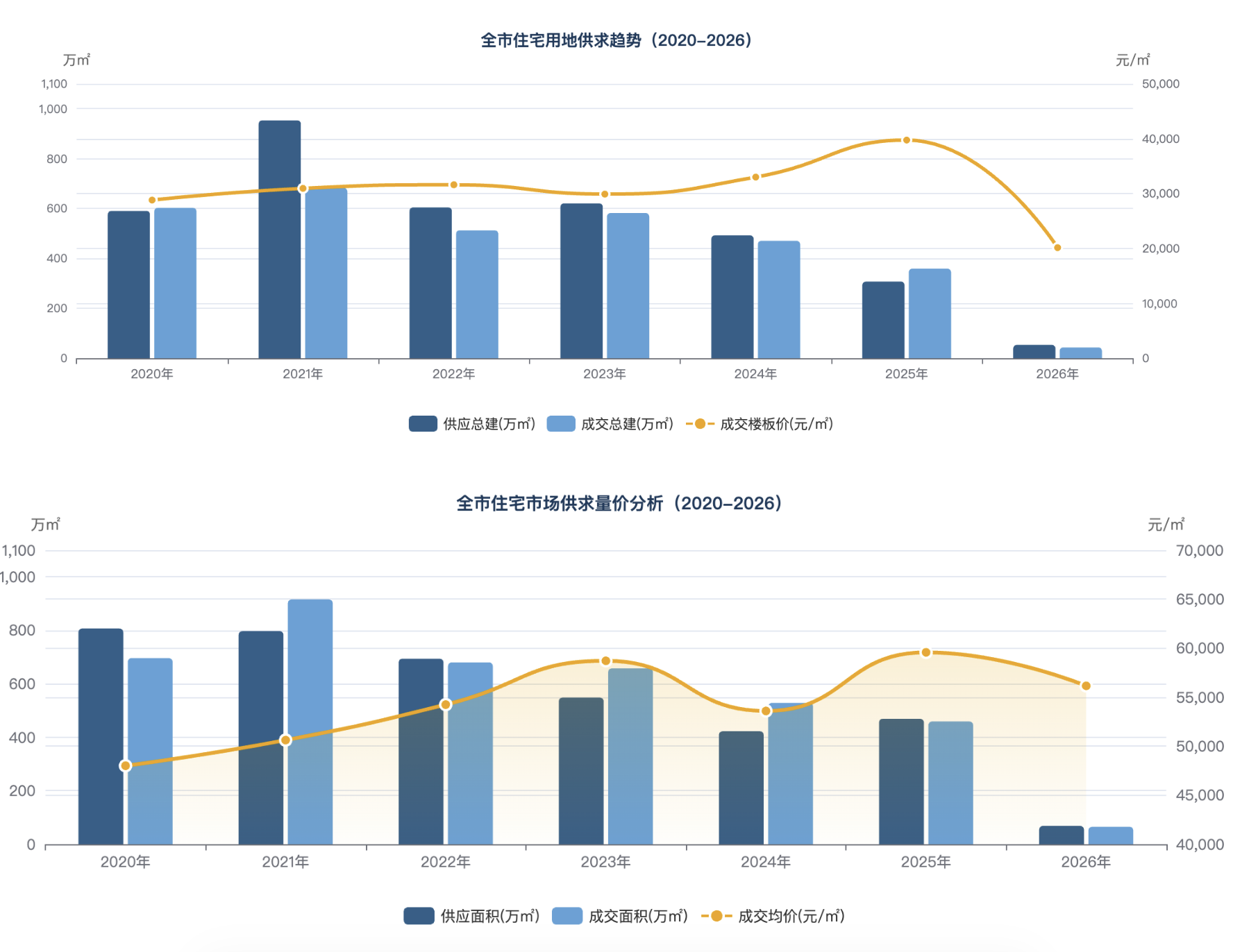 2020至2026年,北京住宅市场呈现规模收缩、价格上移、结构优化的特征。全市住宅用地供求规模先扬后抑,2021年供应总建面达953.47万㎡阶段性峰值后持续收缩;2025年楼板价跃升至39,754元/㎡,同比涨幅20.43%,市场呈现“以价补量”,资源向核心板块、优质地块高度集中。住宅成交层面,2025年成交均价59,575元/㎡创历史新高,高端改善成交占比持续提升。