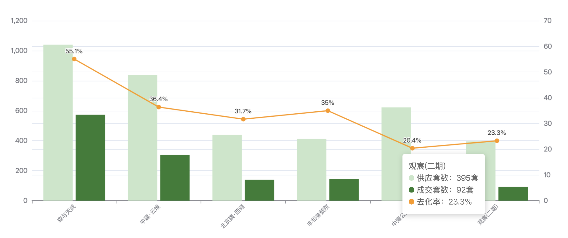 观宸一期2025年4月开盘,供应479户,截至目前网签389套,去化率81.2%,网签均价约7.8万/平,多次斩获丰台新房网签销冠。
