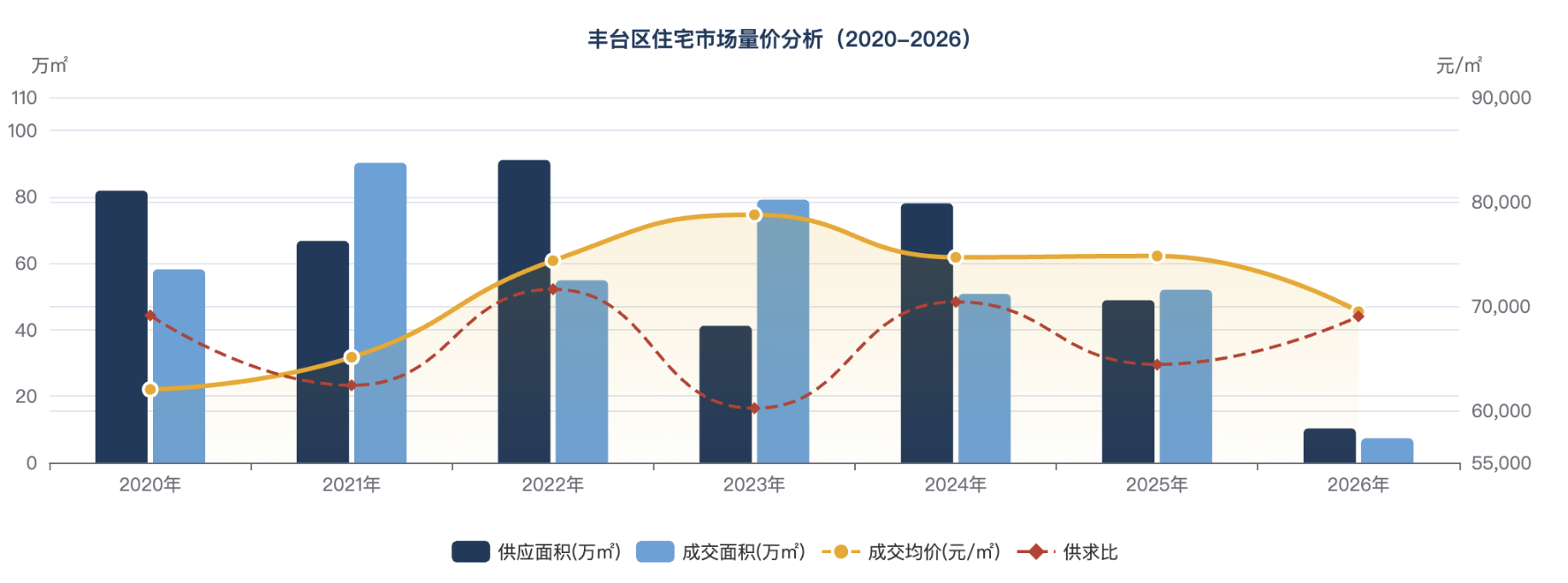 丰台凭借南四环的区位优势、轨道交通网络与丽泽商务区产业辐射,成为承接主城改善外溢的核心区域。2023年以来,区域新房供应呈现量缩价稳特征;2025年丰台区住宅用地成交全部以底价成交,市场热度降至冰点;2025年区域成交均价稳定在74,791元/㎡,逐步尝试回归理性。