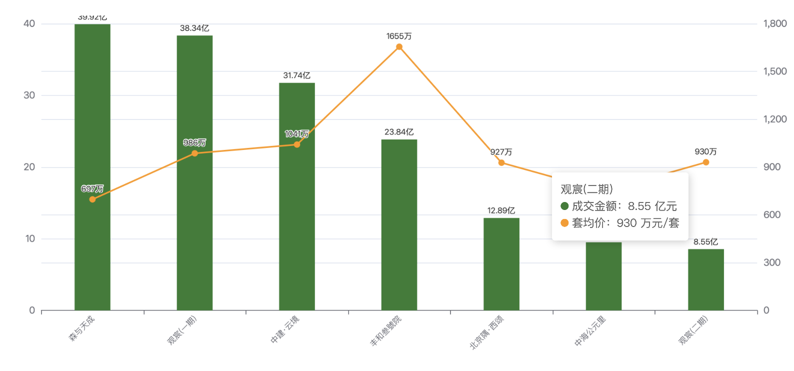 京投发展·森与天成:成交金额39.92亿元居首,成交573套,开盘时间最早(2023年11月),市场积累时间最长,成交均价72,203元/㎡,套均价697万元/套,定位相对亲民;