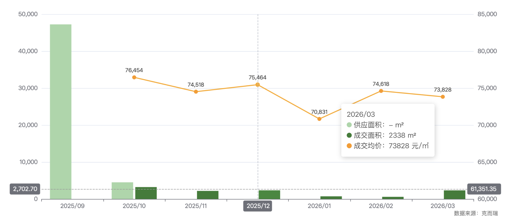 观宸二期2025年9月取证,全面进阶为“纯四居社区”,产品为建面约113-170㎡,供应395套,截至2026年3月累计网签仅92套,去化率约23.3%,供求比高达4.53。月均网签约15套,其中2026年1月仅6套、2月仅5套,淡季表现疲软。3月回升至19套,但整体流速远低于一期同期表现。成交均价从76454元/㎡逐步回落至73828元/㎡,价格重心下移约3.4%,反映出项目正在以价换量。
