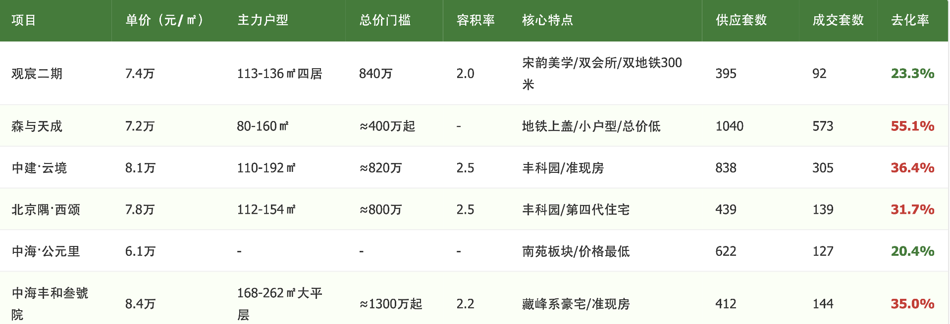 观宸二期在容积率(2.0 vs 2.5)和地铁距离上有优势,但丰科园竞品在产业支撑和资产安全性上更胜一筹。丰科园以1%的土地贡献丰台全区20%的GDP,16.8万高知就业人口构成稳定的购买力池。云境和西颂去化率均约30%+,明显好于观宸二期的23.3%,从市场投票角度看,丰科园板块的认可度更高。如果是4号线/19号线沿线通勤强需求,观宸是板块内的头部选择;如果更看重板块长期价值,丰科园值得多付2000元/㎡溢价。