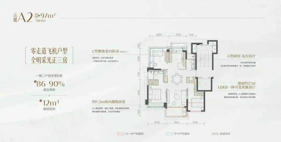 户型方面,97㎡三房两厅一卫,经典三房格局,方正通透无浪费,南北通透,客餐厅一体连通阳台,带270度转角飘窗,动静分区明确,定位刚需入门。