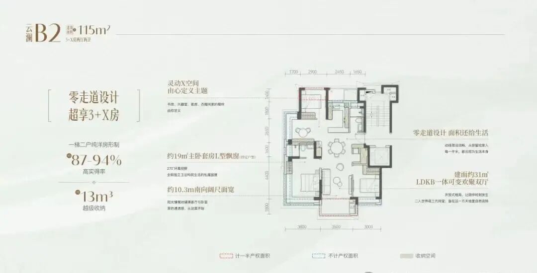 115㎡三房两厅两卫,主卧套房设计带270度转角飘窗,双卫配置,宽景阳台可揽园景与湖光,面向刚改家庭。