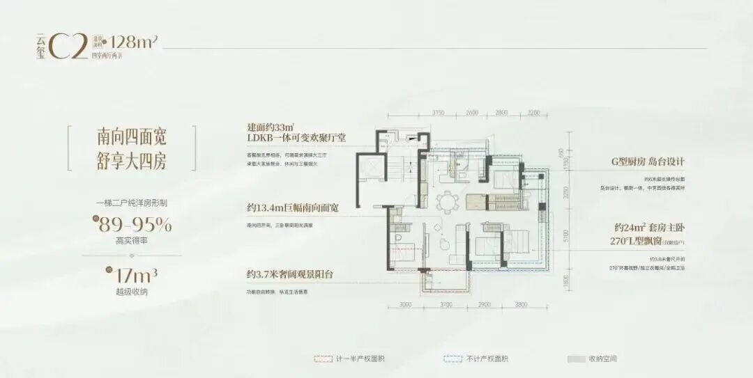 128㎡为四房两厅两卫,大面宽短进深格局,采光通风俱佳,主卧配独立衣帽间,适配二孩或三代同堂的改善需求。