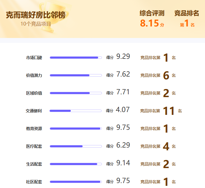 克而瑞作为深耕房地产行业 20 年的专业研究机构,其评测体系以"相邻对标"为核心逻辑——即在定位与地段相近的楼盘间展开多维度比拼,而非简单横向比较。这种机制确保了评选结果的公平性与实用性。