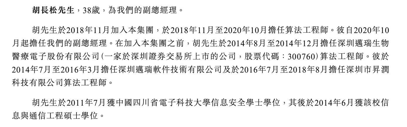 胡长松于2018年11月加入集团,于2018年11月至2020年10月担任算法工程师。其自2020年10月起担任公司的副总经理。在加入集团之前,胡长松于2014年8月至2014年12月担任深圳迈瑞生物医疗电子股份有限公司(股票代码:300760)算法工程师。其于2014年7月至2016年3月担任深圳迈瑞软件技术有限公司及于2016年7月至2018年8月担任深圳市昇润科技有限公司算法工程师。